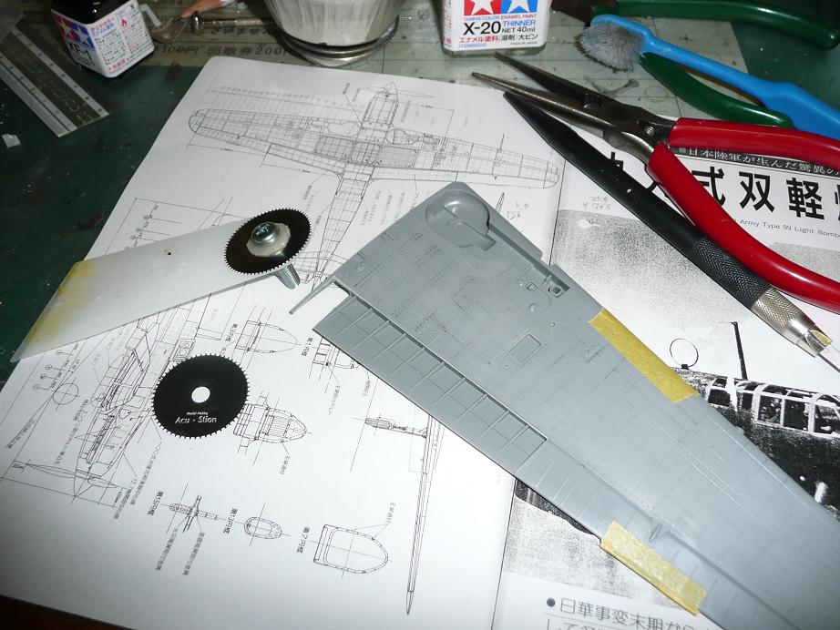 これでリベット打ちが大分楽になりました。それと、フラップを開いた状態にするためにフラップを切り離しました。骨組みのモールドはあらかじめ入っているので工作せずにただ切り離すだけでOK。楽。